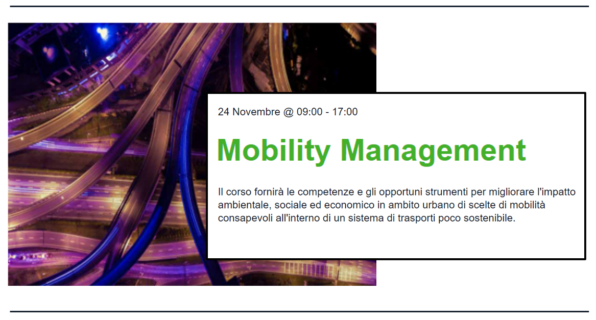 | Il corso, tenuto da docenti di altissimo profilo provenienti dalla Direzione Ingegneria di Roma Capitale e dalla Direzione Generale ISPRA, fornirà le competenze e gli opportuni strumenti per migliorare l’impatto ambientale, sociale ed economico in ambito urbano di scelte di mobilità consapevoli all’interno di un sistema di trasporti poco sostenibile…Per saperne di più